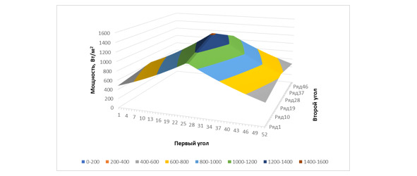 Кроме гидроэлектростанций и более традиционных направлений использующие в основном силу пара, к коим относятся установки теплоэлектростанций и атомных электростанций, применяются и установки зелёной энергетики. Эффективность такого рода устройств базируется на переменчивых факторах в зависимости от погодных условий. Одними из самых активно использующихся направлений в этой области являются солнечные электростанции, основанные на принципе фотоэлектрического эффекта, зависимый от мощностей направляемые от главного источника света, в данном случае Солнца [8—9]. Но в силу погодных условий, неровностей на планете, угла наклона в зависимости от времени года и прочих факторов, имеет место организация зависимости такой системы от указанных условий и параметров, что наглядно было отражено в отдельно посвящённом этому вопросу исследовании [10] (Рис. 1).
