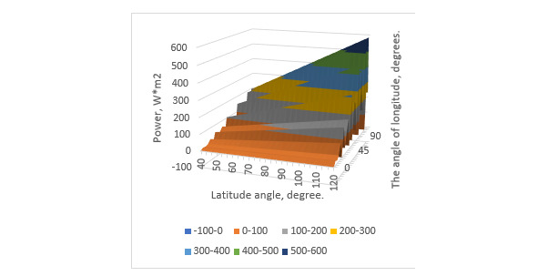 Рис. 1. Трёхмерный график приходящей мощности на поверхность планеты земля на момент 4,5 миллиардов лет после зарождения Солнца [10]