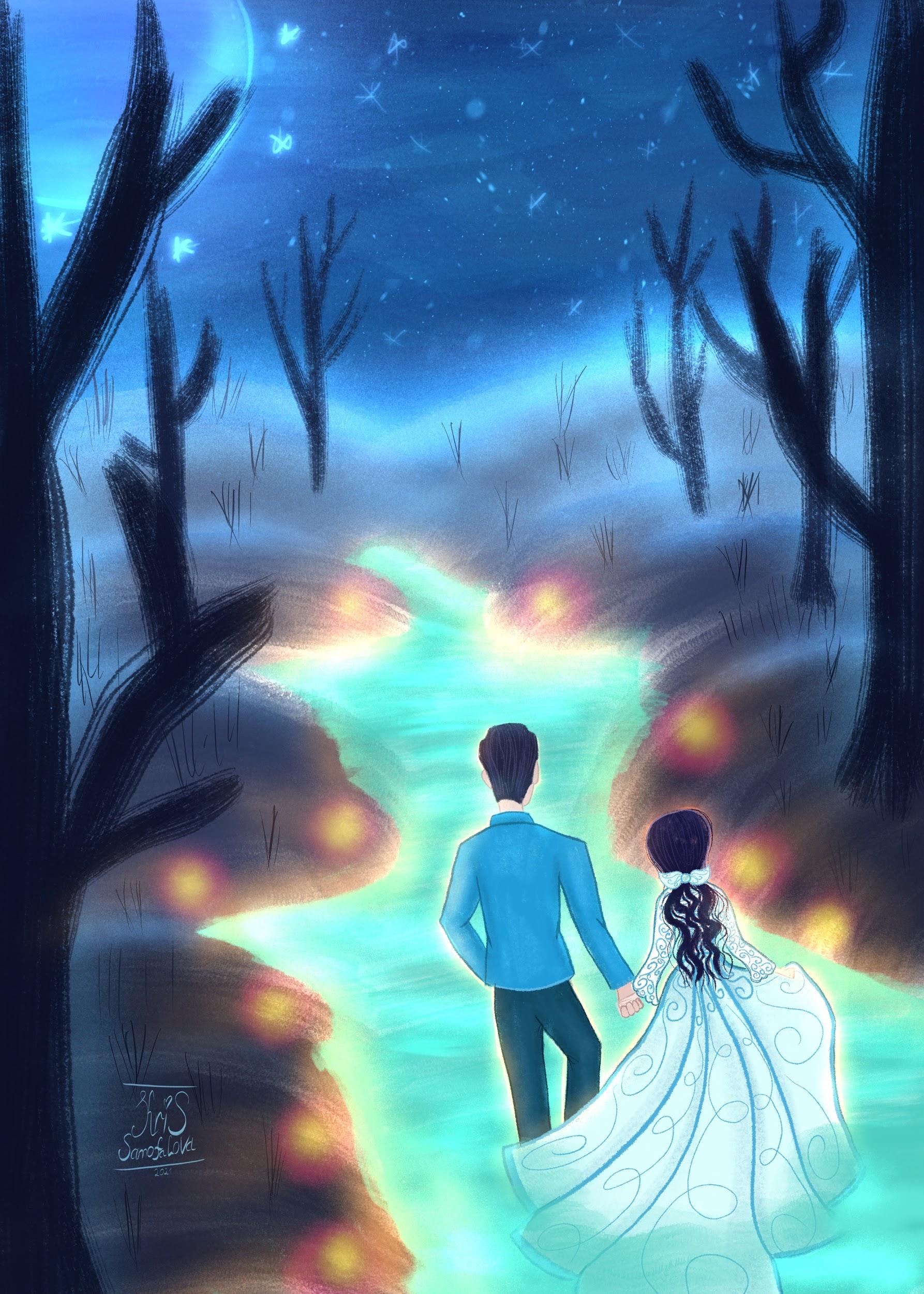 Лунный диск освещал серебряной дымкой ночной лес. Длинный ручей светился красным светом, отражая огни расставленных по периметру свечей. Мужчина и женщина в свадебных одеяниях стояли по щиколотку в ледяных журчащих водах. Их крепко сцепленные руки были связаны красной нитью, а глаза скрывались под белыми повязками с витиеватыми символами.