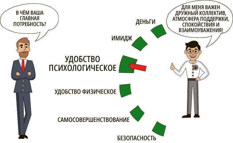 Другой человек может прекрасно себя чувствовать, получая минимальную зарплату, поскольку деньги в его жизни отнюдь не являются самым главным. Для него важна работа в слаженном коллективе и отсутствие конфликтов с коллегами. Такой человек будет стараться всеми силами сглаживать любые противоречия, налаживать контакты с деловыми партнерами, общаться со всеми тепло и открыто. Основной базовой потребностью для него является психологическое удобство.