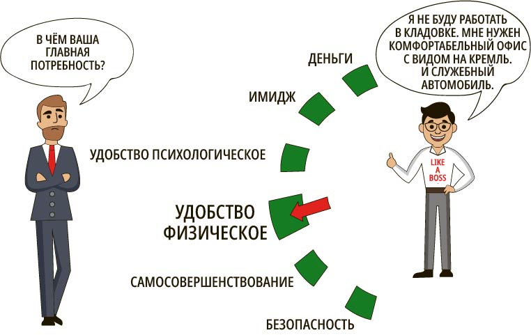Человек, для которого ключевой базовой потребностью является физическое удобство, как правило, при выборе работы ориентируется на местоположение офиса и его удаленность от дома. Когда он находится в комфортных для себя условиях, у него тут же повышается производительность. Если улучшить физические условия работы для такого сотрудника (новый стул, быстрый компьютер, уединенное рабочее место, центральный офис и т. д.), он может начать работать в два раза быстрее и эффективнее!