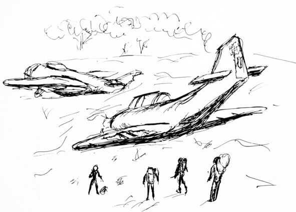 Молодые люди разбрелись между самолетами. Суетливый Продиджи полез внутрь. Пугливый Шнурок, хотя раньше никто не считал его пугливым, остался вместе с Юлей сторожить брошенные рюкзаки. Страус же бродил вокруг, трогал лопасти винтов, царапал ногтями осыпающуюся краску, пару раз заглянул в открытые люки.