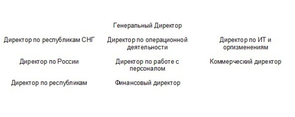 Горизонтальная система управления характерна для западных компаний и некоторых российских компаний, например, консалтинговых компаний. В качестве примера горизонтальной системы управления приведу описание системы управления в одной из западных компаний, работающих в СНГ.