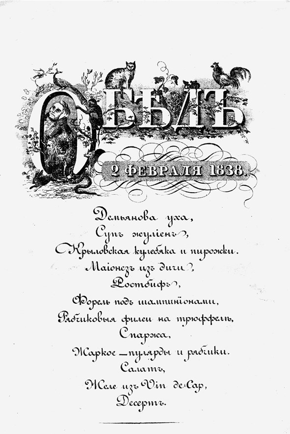 Уникальной особенностью этого издания, отличающей его от других подобных брошюр, стало отсутствие в нем биографии юбиляра. Зато участники обеда находили у своих приборов изящное меню с виньеткой, включающей портрет баснописца в окружении зверей и птиц – персонажей его сочинений. Это курьезное замещение неслучайно: в глазах современников легендарный аппетит баснописца был одной из его визитных карточек. Характерно, что обед, состоявший из блюд французской кухни, открывался русскими кушаньями, шутливо названными «Демьянова уха» и «Крыловская кулебяка и пирожки».