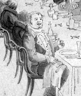 Ил. 21. Крылов на рисунке А. П. Брюллова, изображающем обед в лавке Смирдина. 1832. Фрагмент; см. ил. 17.