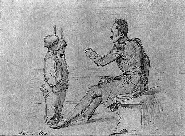Ил. 23. Верне О. Николай I с сыновьями Николаем и Михаилом. 1836.
