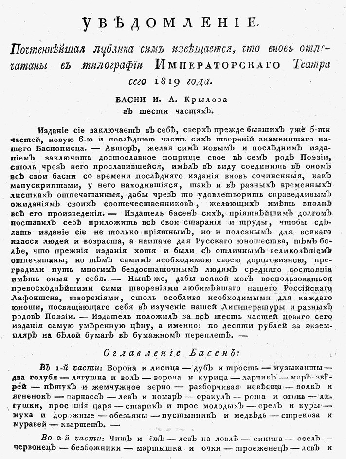 Однако сбыть шесть тысяч экземпляров было не самой тривиальной задачей. Требовалась эффективная реклама, и на третий день после выхода книги в Приложении к «Санкт-Петербургским ведомостям» появилось пространное уведомление, торжественно напечатанное на отдельном листе. Из него потрясенная публика узнала, что ее любимец прекращает писать басни, и нынешнее издание – последнее: