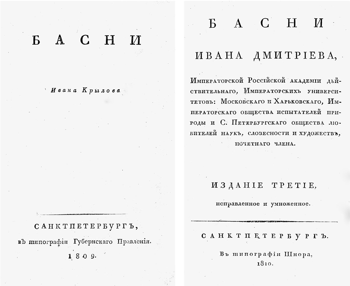 Ил. 3–4. Титульные листы «Басен Ивана Крылова» (1809) и «Басен Ивана Дмитриева» (1810).