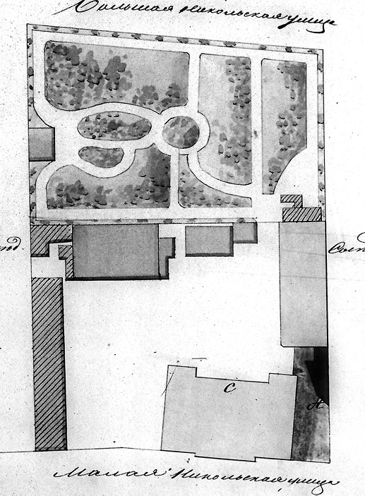 Ил. 14. План владения К. С. Савельева, наследника Крылова. 1851. С – главный дом. Косой штриховкой обозначены строения, возведенные уже после смерти баснописца.