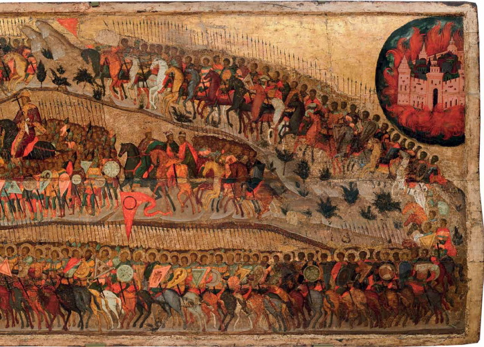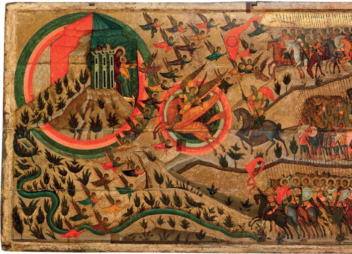Обратимся к самой иконе. На ней мы видим три бесконечных потока воинов, движущихся по трем скалистым отрогам, разделенным пропастью. Во главе воинства прямо над бездной парит верхом на крылатом коне архангел Михаил. Всадник и его конь обведены многоцветной круглой славой, утверждающей их принадлежность к Небесному миру. В одной руке у архангела обнаженный меч, другой, свободной, рукой он указывает воинам на цель их пути – Богоматерь с Младенцем Христом, восседающую на престоле внутри большой четырехцветной круглой славы. Младенец приветствует воинов и раздает ангелам золотые венцы святости, а те увенчивают ими приближающихся всадников. Полуфигуры ангелов, расположенные одна над другой, образуют условную линию – проницаемую границу, проходящую по краю славы и разделяющую Вышний мир – Богоматерь и Христа – и воинскую кавалькаду. Внутри славы кроме фигур Марии и Христа изображена высокая гора; на ее вершине – двухцветный красно-синий шатер-скиния, а перед скинией – стена, ограждающая город. Фигура Богоматери расположена именно перед этой стеной, как неотъемлемая часть града. Скала, на которой стоит город, спускаясь вниз, разрывает границу славы. И за ее пределами, у подножия горы, поросшего деревцами с гибкими кронами, мы видим источник, заключенный в форму прямоугольного кладезя. Ниже этого колодца расположены еще два, меньшего размера. Вытекая из большого, вода попадает в один из стоящих ниже, оставляя второй колодец пустым, и далее течет широким, подобным реке потоком, достигая копыт лошадей нижней вереницы всадников. На другом конце иконы в пространстве золотого фона над горой парит медальон с изображением объятого пламенем города. Этот медальон противолежит круглой славе с Богоматерью и Христом. Словно уменьшаясь в размерах, он закатывается за край вздымающейся из-за горизонта скалы, уступая небосклон восходящему светилу – Небесному граду, к которому устремлены все воины. Впереди верхней кавалькады скачет знаменосец с красным стягом, энергично, галопом, преодолевает подъем, а ему наперерез из-за горного отрога устремляется группа всадников, первой достигающая ангелов с золотыми венцами. Нижняя кавалькада с галопирующим впереди знаменосцем идет более плотным ровным строем. Все воины в броне, со щитами, несущими на себе геральдические изображения. Первые два всадника легко узнаваемы по таким иконографическим признакам, как прически и безбородые молодые лица. Это святой Георгий и святой Димитрий. За шеренгой святых воинов первого плана (с нимбами) вздымаются головы в шлемах и обнаженные головы других воинов, создающие впечатление несметного, неподдающегося счету воинского множества. Центральная группа, грядущая срединным путем меж двух пропастей, состоит из пеших воинов. Они, как телохранители, плотной толпой окружают главного всадника – императора в далматике с лором, в царском венце, с большим выносным Крестом в руках. Впереди этой группы – всадник-знаменосец в броне, шлеме и красном плаще. Именно над его головой три ангела, образующих «геральдическую» группу, держат золотой венец. Замыкают шествие императора и его телохранителей скачущие конники, которые словно торопятся догнать императорскую гвардию и присоединиться к ней. Возглавляет их характерная триада – старец в царском венце и два молодых князя, 