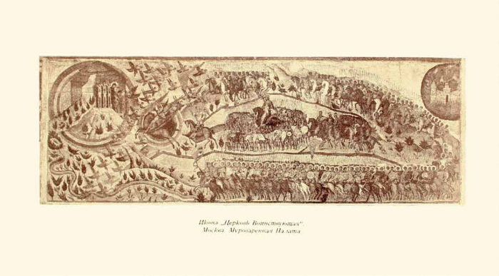 В тот момент, когда икона «Церковь воинствующая» привлекла внимание высокой комиссии, она находилась не в Успенском соборе, а в Мироваренной Палате Патриаршего дворца, на стене в секретарской комнате3. По-видимому, именно из Мироваренной палаты раскрытая в 1914 году икона была передана на Первую выставку Национального Музейного фонда, основанного в 1918 году. В каталоге этой выставки икона датирована началом XVI века и названа образцом полурелигиозной, полусветской живописи4.