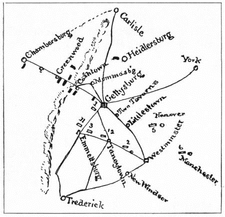 On the 29th all seven of the Union corps were advancing northward like fingers spread apart, and exactly in an inverse order from Lee's three, which were converging on the palm of the hand. On the 30th this divergent order of march continued to conduct the corps still farther apart, with the result also, considering Gettysburg as the ultimate point of concentration, that the bulk of the army was away off to the right of Gettysburg.30 Moreover, Meade's efforts to get the army up to this position, or in front of his chosen line of defence on Pipe Creek, had covered the roads with stragglers, and compelled at least one corps to halt for nearly a whole day.31