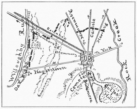 The night passed off quietly. Nevertheless, some thirty thousand Confederates, of all arms, were lying in camp within a radius of eight miles from Gettysburg. Their vanguard had discovered the presence of our cavalry,34 and was waiting for the morning only to brush it away.