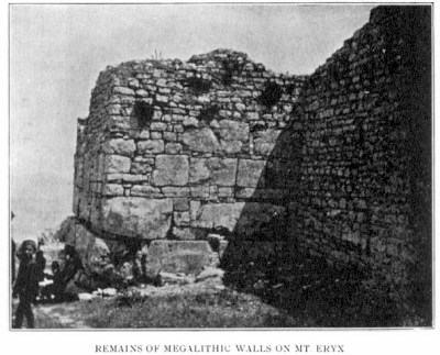 To repeat and to sum up, for I will argue this point no further; I take the Cyclopes to be the conquered remnant of the old Sican inhabitants of Mt. Eryx. They owe their gigantic stature to the huge size of the stones with which the walls of their city on Mt. Eryx were built. These stones show few or no signs of having been worked with a tool of hardened bronze or iron, save in so far as the Phœnicians may have trimmed them here and there when they rebuilt the walls, in part, de novo, with stones some of which bear quarry-men's marks in Phœnician characters.74 The old Sican work, a good deal of which has been allowed to stand, belongs to the true megalithic age, when it was cheaper to carry than to cut; later generations, failing to consider the revolution which the introduction of improved methods of cutting had effected, argued that the men who built with such large stones must have been large men, whereas in reality they were only economical men.