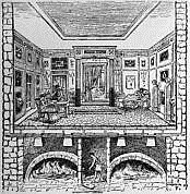 The brazier satisfied the wants of Greece, but the colder climate of Rome required something better; and in their efforts to invent something better, the ancient Romans made real progress in the art of warming their houses. They built a fire-room – called a hypocaust– in the cellar, and, by means of pipes made of baked clay, they connected the hypocaust with different parts of the house (Fig. 4). Heat and smoke passed up together through these pipes. The poor ancients, it seems, were forever persecuted by smoke. However, after the wood in the hypocaust was once well charred, the smoke was not so troublesome. The celebrated baths (club-rooms) of ancient Rome were heated by means of hypocausts with excellent results. Indeed, the hypocaust had many of the features and many of the merits of our modern furnace. Its weak feature was that it had no separate pipe to carry away the smoke. But as there were no chimneys yet in the world, it is no wonder there was no such pipe.