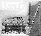 The eleventh century brought a great improvement in the art of heating, and the improvement came from England. About the time of the Conquest (1066) a great deal of fighting was done on the roofs of English fortresses, and the smoke coming up through the hole in the center of the roof proved to be troublesome to the soldiers. So the fire was moved from the center of the floor to a spot near an outside wall, and an opening was made in the wall just above the fire, so that the smoke could pass out. Here was the origin of the chimney. Projecting from the wall above the fire was a hood, which served to direct the smoke to the opening. At first the opening for the smoke extended but a few feet from the fire, but it was soon found that the further up the wall the opening extended the better was the draft. So the chimney was made to run diagonally up the wall as far as possible. The next and last step in the development of the chimney was to make a recess in the wall as a fireplace, and to build a separate structure of masonry – the chimney – for the smoke. By the middle of the fourteenth century chimneys were usually built in this way (Fig. 5). As the fireplace and chimney cleared the house of soot and smoke, they grew in favor rapidly. By the end of the fifteenth century they were found in the homes of nearly all civilized people.