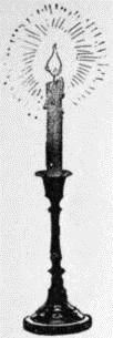 In the course of time it was discovered that it was better to smear the grease on the outside of the stick, or on the outside of whatever was to be burned; that is, that it was better to have the wick inside. Torches were then made of rope coated with resin or fat, or of sticks or splinters smeared with grease; here the stick resembled the wick of the candle as we know it to-day, and the coating of fat corresponded to the tallow or paraffin. Rude candles made of oiled rope or of sticks smeared with fat were invented in primitive times, and they continued to be used for thousands of years after men were civilized. In the dark ages – and they were dark in more senses than one – torch-makers began to wrap the central stick first with flax or hemp and then place around this a thick layer of fat. This torch gave a very good light, but about the time of Alfred the Great (900 A.D.) another step was taken: the central stick was left out altogether, and the thick layer of fat or wax was placed directly around the wick of twisted cotton. All that was left of the original torch – the stick of wood – was gone. The torch had developed into the candle (Fig. 3). The candles of to-day are made of better material than those of the olden time, and they are much cheaper; yet in principle they do not differ from the candles of a thousand years ago.