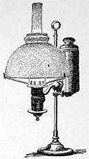 Late in the eighteenth century the improvement came. In 1783 a man named Argand, a Swiss physician residing in London, invented a lamp that was far better than any that had ever been made before. What did Argand do for the lamp? Examine an ordinary lamp in which coal-oil is burned. The chimney protects the flame from sudden gusts of wind and also creates a draft of air,7 just as the fire-chimney creates a draft. Argand's lamp (Fig. 7) was the first to have a chimney. Look below the chimney and you will see open passages through which air may pass upward and find its way to the wick. Notice further that as this draft of air passes upward it is so directed that, when the lamp is burning, an extra quantity of air plays directly upon the wick. Before Argand, the wick received no supply of air. Now notice – and this is very important – that the wick of our modern lamp is flat or circular, but thin. The air in abundance plays upon both sides of the thin wick, and burns it without making smoke. Smoke is simply half-burned particles (soot) of a burning substance. The particles pass off half-burned because enough air has not been supplied. Now Argand, by making the wick thin and by causing plenty of air to rush into the flame, caused all the wick to be burned and thereby caused it to burn with a white flame.