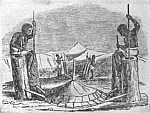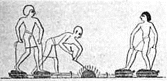 The hillside furnace worked well enough when the wind was favorable, but when the wind was unfavorable there was no draft and no iron could be made. So ironmakers found a way by which the air could be driven into the furnace by artificial means. They invented the bellows, a blowing apparatus (Fig. 3) which was usually made of goat skins sewed together and which was operated either by the hands or by the feet (Fig. 4). Sometimes the bellows consisted of a hollow log in which a piston was worked up and down (Fig. 5). After the invention of the bellows, ironmakers could make their iron whenever and wherever they pleased, for they could force air into their furnaces at any time and at any place. This rude bellows forcing a draft of air into a half-closed furnace filled with a burning mass of charcoal and iron ore was the first form of the forge, one of the greatest of all inventions.