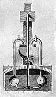 It was not very long before an Englishman put into practice what the Italian had only suggested. Edward Somerset, the Second Marquis of Worcester, in 1663 built a steam-engine that raised to the height of forty feet four large buckets of water in four minutes of time. This was the first useful work ever done by steam. Figure 4 shows the construction of Worcester's engine.