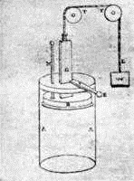 The first engines were not safe. Often the steam pressed too heavily upon the sides of the vessel in which it was compressed and there were explosions. About 1680 Denis Papin, a Frenchman, invented the safety valve, that is a valve that opens of its own accord and lets out steam when there is more in the vessel than ought to be there. About ten years later Papin gave the world another most valuable idea. In Worcester's engine the steam in the steam chest pressed directly on the water that was to be forced up. Papin showed a better way. He invented the engine shown in Figure 6. In this engine a small quantity of water was placed in the bottom of the cylinder A. Fitting closely in the cylinder was a piston B such as Papin had seen used in ordinary pumps. We will suppose that the piston is near the bottom of the cylinder and that a fire is built underneath. The bottom being made of very thin metal the water is rapidly converted into steam and thus drives the piston up to the top as shown in the figure. Here a latch E catches the piston-rod H and holds the piston up until it is time for it to descend. Now the fire is removed and the steam, becoming cold, is condensed and a vacuum is formed below the piston. The latch E now releases the rod H and the piston is driven down by the air above it, pulling with it the rope L which passes over the pulleys TT. As the rope descends it lifts a weight W or does other useful work. As the inventor of the piston Papin ranks among the greatest of those whose names are connected with the development of the steam-engine.