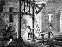 The invention of the blast furnace marked the beginning of a new era in the history of iron making. In the first place there was produced in the blast furnace a kind of iron that was entirely different from that which was produced in the primitive forge. In the primitive forge there was made a lump of practically pure unmelted iron, known as wrought iron. In the blast furnace there was produced a somewhat impure grade of melted iron, known as cast iron, or pig11 iron. In the second place, the blast furnace produced iron in quantities vastly greater than it was ever produced by the old forge. In the blast furnace more iron could be made in a day than could be made by the forge in a month. In some of the early blast furnaces a thousand pounds of iron could be made at one melting and we read of one early furnace that produced 150 tons of iron in a year.
