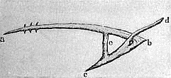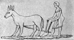 An improvement upon the simple forked stick is seen in Figure 3, which is copied from an ancient monument in Syria (in Asia Minor). The old Syrian plow consists almost wholly of the natural crooks of a branch of a tree, the only artificial piece being the brace e which connects the share and the beam and holds them firm. In this crooked stick we have three of the main parts of the modern plow, the beam (a), the share (c-b) and the handle (d). The plow in this form requires the services of two persons – one to draw the plow and one to guide it and keep it in the ground. It is said that it was with a plow of this kind that the servants of Job were plowing when they were driven from their fields by the Sabeans.