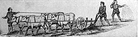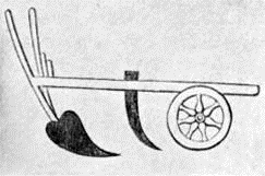 Many centuries passed before any real improvement was made upon the old Egyptian plow. If there were any improvement anywhere it was among the Romans. We read in Pliny – a Roman writer of the first century – of a plow that had wheels to regulate the depth of the plow and also a coulter, that is, a knife fixed in front of the share to make the first cut of the sod (Fig. 6). But such a plow was not in general use in Pliny's time. A thousand years later, however, the plow with wheels and coulter was doubtless in common use. In a picture taken from an old Saxon print we see (Fig. 7) a plow which was used in the time of William the Conqueror (1066). Here the plow has a coulter inserted in the beam and there are two wheels to regulate the depth to which the plow may go. This Saxon plow is drawn by four fine oxen and it is plainly a great improvement upon the old Egyptian plow.