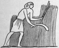 When the sickle first began to be used is of course unknown. Among the remains of the "stone age" (p. 39) are implements of flint which resemble the sickle, while among the remains of the so-called "bronze age" many primitive sickles made of bronze have been found. Nor do we know where the sickle was first used, although Egypt seems to have been the first home of the sickle just as it was the first home of the plow. Upon the wall of a building of ancient Thebes is a picture of an Egyptian harvest scene. Two men with sickles are cutting the wheat. A man following the reapers seems to be gleaning, that is, picking up the wheat that the reapers have cut. Other harvesters are carrying the grain to the threshing place where it is tramped out by the slow feet of oxen. A primitive sickle such as was used by the Egyptians was used by all civilized nations in ancient times, by the Hebrews, by the Greeks, and by the Romans.