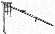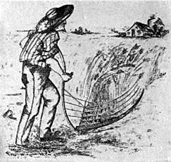 For more than a thousand years after the appearance of the Roman scythe agriculture in Europe was everywhere neglected and little or no improvement was made in farming implements. About the end of the Middle Ages, however, improvements in the form of the scythe began to appear. In Flanders farmers began to use an implement known as the Hainault scythe (Fig. 4). This scythe had a fine broad blade and a curved handle. When reaping with this scythe the reaper with his left hand brought the stalks of grain together with a hook and with his right hand he swung the scythe and cut the grain. This scythe was an improvement upon the sickle but it was still a very awkward implement.
