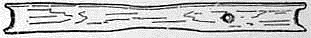 In the old African loom represented in Fig. 7 we find several improvements upon the loom of the Pueblo woman. In the first place, it has two heddles instead of one. These are operated by the feet, leaving the hands free to do other work. In the second place, the wooden frame which the weaver holds in his right hand is not to be seen in the Pueblo loom. This frame called the batten, or lathe, contains the reed, which is a series of slats or bars between which the threads of the warp pass after they leave the heddle. When the weaver has thrown the weft through the shed he brings the batten down hard and the reed drives the last weft thread close to the woven part of the cloth. The reed takes the place of the sword-like stick used by the Pueblo woman. Last and most important: in the African's left hand is the shuttle, or little car – weaver's ship, the Germans call it – which carries the weft across (Fig. 8).