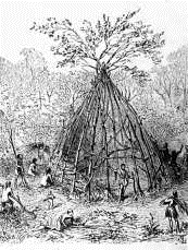 If one could have traveled over the earth during the first days of man's history one would doubtless have found that dwellings were made of wood, for in those days the greater part of the earth was covered with forests. To build a home in the forest was the simplest of tasks. All that was necessary was to fasten together the tops of several saplings, interlace the saplings with boughs (Fig. 1) and cover the frame with skins of animals or thatch it with leaves and grass. A cone-shaped structure of this pattern, a tent, or hut, or wigwam, was the first house of all primitive people who lived where there was plenty of wood.