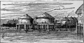 Coming down from the highlands to the lowlands where there were swamps and marshes or where inland lakes were numerous, we find that the first houses were built upon piles driven in the water or in the mud (Fig. 3). These lake-dwellings, as houses of this kind were called, were generally connected with the mainland by gangways of wooden piers, although sometimes they could be approached only by boat. In the floors of some of these curious dwellings were trapdoors through which baskets could be lowered for catching fish in the lake below. The children of the lake-dwellers were tethered by the feet to keep them from falling into the water. The beautiful city of Venice in its infancy was a community of lake-dwellers. The rough canoe of the lake-dwelling time has developed into the graceful gondola, and the rude wooden pier has grown to be the magnificent Rialto.