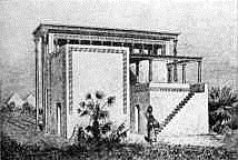 Our story takes us back many thousands of years to Egypt, the cradle of civilization. From Egypt it will take us to Greece, thence to Rome, thence to the countries of Northern Europe, thence to America. What kind of houses did the Egyptians first build? They built as simple a structure as can be imagined; they erected four walls and over these they placed a flat roof (Fig. 5). The roof was made flat because in Egypt there is scarcely any rain and there was no need for a roof with a slant. In all those countries where rain seldom falls, or never falls, the flat roof is the natural roof (Fig. 6). Although their buildings were simple in construction the Egyptians left behind them most remarkable specimens of the builder's art. Their pyramids and monuments and sphinxes and palaces have always been foremost among the great wonders of the world. Figure 7 shows the interior of an ancient Egyptian palace. This palace had only an awning for a roof. That was all that was necessary to keep out the rays of the sun. Notice the lofty pillars or columns of this building. You see they are adorned above or below with the figure of the lotus, the national flower of the Egyptians. The column, as we shall see, plays an important part in the history of the house and it was ancient Egypt that gave the world its first lessons in the art of making columns.