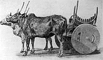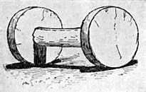 We are told by some writers that the rolling log (the one-wheeled cart) was followed by the two-wheeled cart, on which the wheels were the ends of a log and the axle was the middle portion of the log hewn down to a proper size (Fig. 8). Here wheels and axle turned together precisely like a modern car wheel. This makes a very pretty story but I am afraid the solid two-wheeled affair represented in Figure 8 is only imaginary, and that in a true account of the development of the cart it has no place. The true beginning of the two-wheeled cart may be learned from Figure 9. Here the wheels are two very short logs through the center of which are holes in which the round ends (axles) of a piece of timber (the axle-tree) fit. When the cart moves, the wheels turn upon the axle. The one-wheeled cart had at first one log turning with the axle; the two-wheeled cart at first had as its wheels two very short logs turning on the axles.