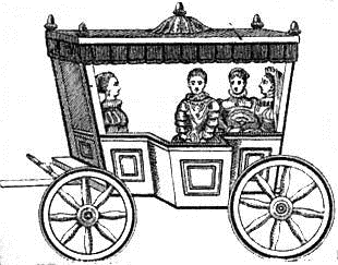 Bring the hind part of one Egyptian chariot opposite to the hind part of another, lash the two chariots together, remove the tongue of one of the chariots and you have made a chariot of four wheels or a coach. The form of the most ancient of four-wheeled carriages leads to the belief that the coach was first made by joining together two two-wheeled chariots in the way just described. The ancient Egyptians had their four-wheeled chariots but only their gods and their kings had the privilege of riding in them. For centuries none but the great and the powerful rode in coaches. The Roman chariot (Fig. 14), bad imitations of which we see nowadays in circus processions, was used only in the splendid triumphal processions which entered Rome after a great victory. In the Middle Ages we get a glimpse of a four-wheeled carriage now and then, but usually the king or a queen is lounging in it (Fig. 15). The coach could not be generally used in Europe in medieval times because the roads were so bad. The excellent roads made by the Romans had not been kept in good condition. Traveling had to be done either on horseback or in the two-wheeled carriage. In 1550 there were but three coaches in Paris and in London there was but one. In 1564, however, we find Queen Elizabeth riding in a coach (Fig. 16) on her way to see her lover, Lord Leicester. Insert more spokes and lighter ones in the wheels of this coach of the queen's, put on rubber tires and mount the body on elliptical springs17 and we will have the coach of to-day.