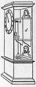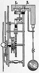 The last important step in the development of the clock was taken when the pendulum was brought into use. The history of the pendulum will always include a story told by Galileo. This great astronomer, the story runs, while worshiping in the cathedral at Pisa one day, found the service dull, and began to observe the swinging of the lamps which were suspended from the ceiling. Using his pulse as a timekeeper he learned that where the chains were of the same length the lamp swayed to and fro in equal length of time, whether they traveled through a short space or a long space. This observation set the philosopher to experimenting with pendulums of different lengths. Among the many things he learned one of the most important was this: a pendulum thirty-nine inches in length will make one vibration in just one second of time. Now, if the pendulum could only be kept swinging and its vibrations counted it would serve as a clock. Galileo, of course, saw this, and he caused to be made a machine for keeping the pendulum in motion (Fig. 11), but he did not make a clock; he did not connect his pendulum with the works of a clock. This, however, was done about the middle of the seventeenth century, although it is somewhat difficult to tell who was the first to do it. The honor is claimed by an Englishman, a Frenchman, and a Dutchman. The truth is, clockmakers throughout Europe were trying at the same time to make the best of the discoveries of Galileo, and several of them about the same time constructed clocks with pendulums. The one who seems to have succeeded first was Christian Huygens, a Dutch astronomer, who, in 1656, constructed a clock, the motions of which were regulated by the swinging of a pendulum (Fig. 12). The weight was attached to a cord passing over a pulley and gave motion to all the wheels, as in De Vick's clock. Like De Vick's clock also Huygens's clock had its escapement wheel acting upon two pallets. In the Dutchman's clock, however, the escapement, instead of turning a balance beam to and fro, acted upon the pendulum, giving it enough motion to keep it from stopping.