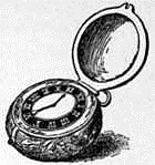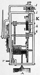 The water-clock just described led easily and directly to the weight-clock. Clockmakers in the Middle Ages for centuries tried with more or less success to make clocks that would run by means of weights. In 1370, Henry De Vick, a German, succeeded in solving the problem. De Vick was brought to Paris to make a clock for the tower of the king's palace, and he made one that has become famous. In a somewhat improved form it can still be seen in Paris in the Palais de Justice. Let us remove the face of this celebrated timepiece and take a look at its works (Fig. 8). It had a striking part, and a timekeeping part, each distinct from the other. The figure shows only the timekeeping part. The weight (A), of 500 pounds, is wound up by a crank (the key) at P. O is the hour-hand. If A is allowed to descend, you can easily see how the whole system of wheels will be moved – and that very rapidly. But if something does not prevent, A will descend faster and faster, the hour-hand will run faster and faster and the clock will run down at once. If the clock is to run at a uniform rate and for any length of time, the power of the weight must escape gradually. In the clepsydra (Fig. 1) the descent of the weight was controlled by the size of the stream of flowing water. De Vick invented a substitute for the stream of flowing water. Fasten your attention upon the workings of the saw-toothed wheel II and the upright post K, which moves on the pivots l and k, and you may learn what he did. Fixed to the upper part of the post K is a beam or balance LL, at the ends of which are two small weights m and m, and projecting from the post in different directions are two pallets or lips i and h. Now, as the top of the wheel II turns toward you, one of its teeth catches the pallet i and turns the post K a part of the way round toward you. Just as the tooth escapes from i a tooth at the bottom of II (moving from you) catches the pallet h and checks the revolving post and turns it from you. Thus as II turns, it gives a to-and-fro motion to the post K and, consequently, a to-and-fro motion to the balance LL. II is called the escapement because the power of the descending weight gradually escapes from its teeth. In the clepsydra the trickling of water regulated the descent of the weight; in De Vick's clock the trickling of power or force from the escapement regulated the descent of the weight. The invention of this escapement is the greatest event in the history of the clock. The king was much pleased with De Vick's invention. He gave the clockmaker three shillings a day, and allowed him to sleep in the clock tower; a scanty reward indeed for one who had done so much for the world, for De Vick's invention led rapidly to the excellent timepieces of to-day, to both our watches and our clocks. After the appearance of the weight-clock, the water-clock gradually fell into disuse, and all the ingenuity of the clockmaker was bestowed upon weights and wheels and escapements and balances. A century of experimenting resulted in a clock without a weight (Fig. 9). In this timekeeper you recognize the beginnings of the modern watch. The uncoiling of a spring drove the machinery. Instead of the balancing beam with its weights as in De Vick's clock, a balance wheel is used. The escapement is the same as in the first weight-clock. The busy and delicately-hung little balance wheel in your watch is a growth from De Vick's clumsy balance beam. The spring-clock would run in any position. Because it could be carried about it led almost at once to the watch. Many places claim the distinction of having made the first watch, but it seems that the honor belongs to the city of Nürenburg. "Nürenburg eggs," as the first portable clocks were called, were made as early as 1470. The first watches were large, uncouth affairs, resembling small table clocks but by the end of the sixteenth century small watches with works of brass and cases of gold or silver were manufactured (Fig. 10).