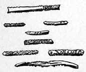 The first step in the growth of the book was taken when memory aids were invented. Sometimes we tie a knot in a handkerchief to help us to remember something. Now, it was just by tying knots that primitive man first lent assistance to the memory. The first material book was doubtless a series of knots well represented by the quipu (Fig. 2) of the ancient Peruvians. This curious-looking book was written (tied) by one known as the officer of the knots. It contains an account of the strength of the Peruvian army, although it is confessed that its exact meaning cannot be made out. It was not intended to be read by any one who was not a keeper of the knots. Books made of knots were used by nearly all the ancient peoples of South America and by some of those of Asia. Akin to the knotted cord is the notched stick, which is still used in Australia by the savages to assist the memory of one who has a message to carry. Figure 3 shows a variety of such message-sticks. The lowest one – a crooked branch of a tree – contains an invitation to a dancing party. The notches are read by the messenger. The notched stick as an aid to memory is not confined to savage races. Many a highly civilized baker has kept his accounts by making notches in sticks and so has many a modern dairyman, as he has delivered milk from door to door.