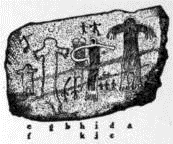 Memory aids were followed by picture-writing. To express thought by means of pictures is an instinct shared alike by the lowest savage and the most enlightened people. All over the earth we find examples of early picture-writing. A beloved chief had died, a fierce battle had been fought, an exciting chase had occurred: promptly the event was pictured on a stone or on the skin of some animal. Pages might be filled with illustrations of these primitive picture-books, but we must be content with a single specimen (Fig. 4). This was found painted on a rock in California: "We selected this as a camping place, but we have found nothing," say the human figures f, g, h, i. The upturned palms say plainly, "nothing, nothing." "One of our comrades (d) has died of starvation," say the three lank figures at c pointing to their own lean bodies. "We deeply mourn his loss," says the sorrow-stricken a. "We have gone northward," says j, his distinguished arm extended to the north.