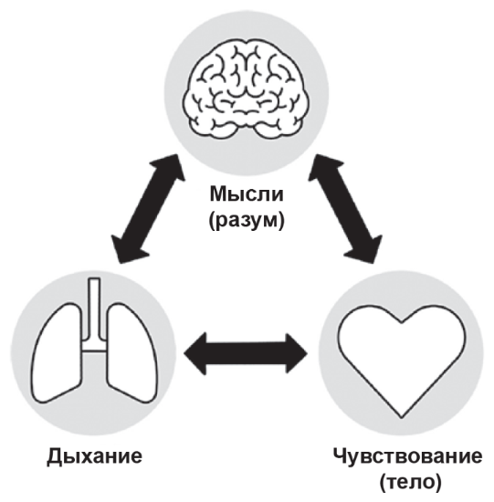 ДЫХАНИЕ, МЫШЛЕНИЕ И ЧУВСТВОВАНИЕЗнакомство с вегетативной нервной системой подводит нас к фундаментальному принципу дыхания: не только то, как вы дышите, влияет на то, как вы мыслите и чувствуете, но и то, как вы мыслите и чувствуете, обусловливает то, как вы дышите. Это своего рода петля обратной связи. И я вас через нее проведу. Мыслительный процесс протекает в мозге. Чувства рождаются в теле под воздействием дыхания. Мысли и чувства изменяют характер дыхания, а оно меняет чувства, которые, в свою очередь, меняют мышление.