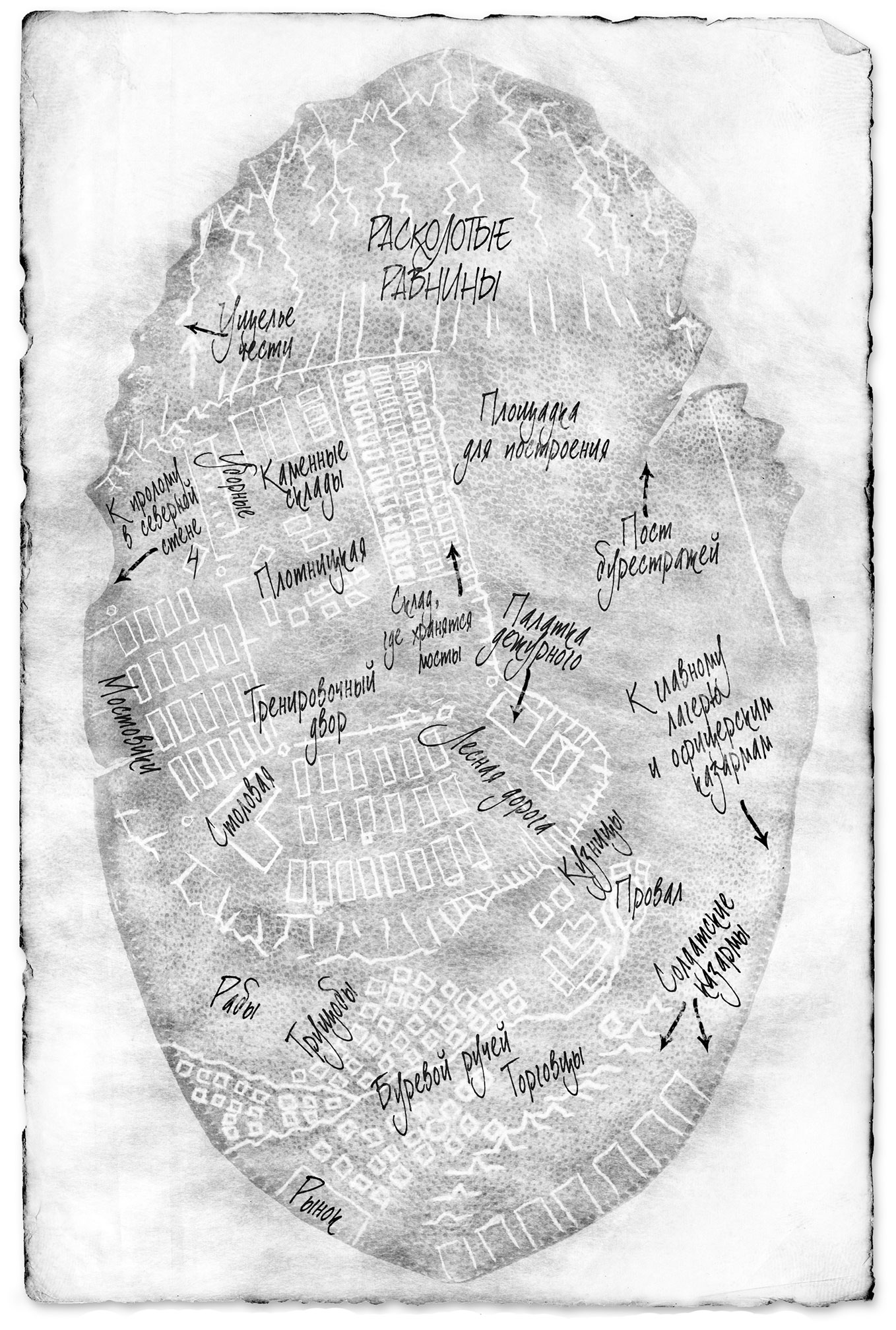 Солдаты повели Каладина в северо-восточную часть лагеря, и путь оказался долгим. Хотя каменные казармы были совершенно одинаковыми, край лагеря все время менялся, как зазубренный горный хребет. Старые привычки вынудили Каладина запомнить дорогу. Там, куда они пришли, высоченная стена оврага была разбита бесчисленными бурями, и сквозь брешь открывался обширный вид на восток. Это открытое пространство давало хорошую возможность войску собраться, прежде чем спуститься по склону на сами Расколотые равнины.