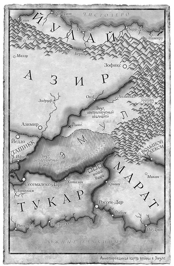 – Убедись, что армии, с которыми мы будем сражаться в Эмуле, не были тайно усилены. Подобное может иметь для нас ужасные последствия – единственная катастрофа, которую я могу себе вообразить, это осада Азимира и невозможность туда попасть через Клятвенные врата. Мне бы не хотелось оказаться на месте тех, кто там застрянет.