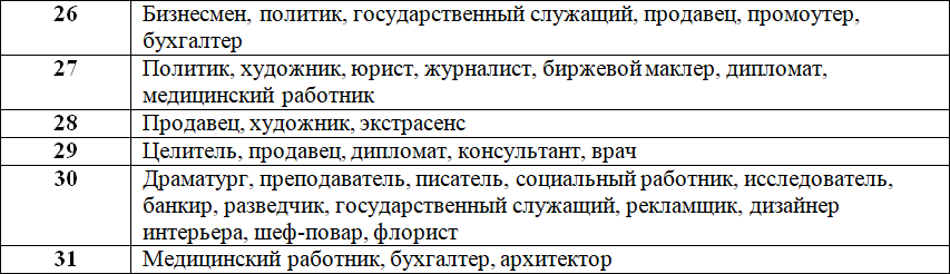 26. Это сочетание Луны и Венеры дает хороший финансовый успех и привлекает противоположный пол. Поскольку числом управляет Сатурн, люди, родившиеся в этот день, сталкиваются с борьбой в ранние годы жизни и добиваются большого успеха намного позже. Они тактичны, очень амбициозны, услужливы, трудолюбивы, смелы, уверены в себе и щедры. Обладают организаторскими способностями. Их любовь к своей работе делает их равнодушными к отношениям. Они упрямые, властные и ревнивые. Не могут выразить свои чувства. Они не должны начинать слишком много дел одновременно. Они гордятся своим имуществом и любят выставлять его напоказ. Мужчины мстительны, суровы и ожесточены, если у них возникает вражда с кем-либо, но, с другой стороны, они могут оказывать помощь нуждающимся. Им следует вдумчиво выбирать спутника жизни.