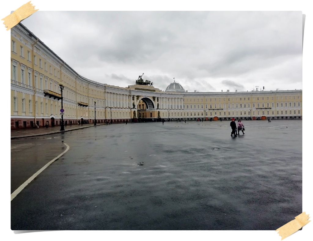 Дворцовая площадь – это архитектурный ансамбль, возникший во второй половине XVIII – начале XIX века. Согласна данными википедии, площадь образуют памятники истории и культуры федерального значения: Зимний дворец, Здание штаба Гвардейского корпуса, Здание Главного штаба с Триумфальной аркой и Александровская колонна (я привыкла называть её столпом, думаю, как и многие жители города, а причина скорее всего кроется в стихотворении А.С. Пушкина «Памятник»).