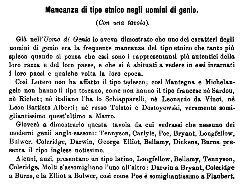 Еще в 1889 году Ломброзо заявлял, что «этническая прививка – важнейший фактор прогресса страны» (Bulferetti 1975: 363). Например, алфавит был плодом семитско-египетского контакта; англичане, результат смешения кельтов, германцев и латинян – самый развитый народ Европы; прекрасен был город Триест, где славянская кровь смешалась с немецкой, еврейской и славянской. В статье 1906 года под названием «Новые источники эстетики», ЧЛ писал, что «самым активным элементом всего исторического прогресса является искусство смешиваться с другим народом и другим временем, несмотря на наличие или отсутствие превосходства, как определенно случилось в ситуации с маврами и византийцами [он это писал о Венеции]» (Lombroso 1906: 141).