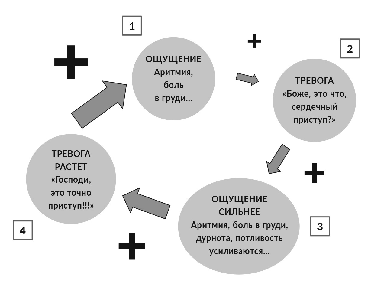 Однажды у человека ни с того ни с сего сердце начинает колотиться или предательски сбиваться с ритма. В силу мнительности или из-за сходства ощущений с симптомами сердечного приступа наш герой ошеломлен и напуган. Теперь представим себе, что несколько недель назад кто-то из его родственников умер как раз от инфаркта. Тогда во время приступа аритмии бедняга почти автоматически подумает: «О нет! У меня точно сердечная недостаточность!» Естественно, от тревоги сердце мгновенно забьется еще быстрее, и – вот проклятье! – ощутив это, человек начнет еще сильнее тревожиться. Порочный круг страха создан!