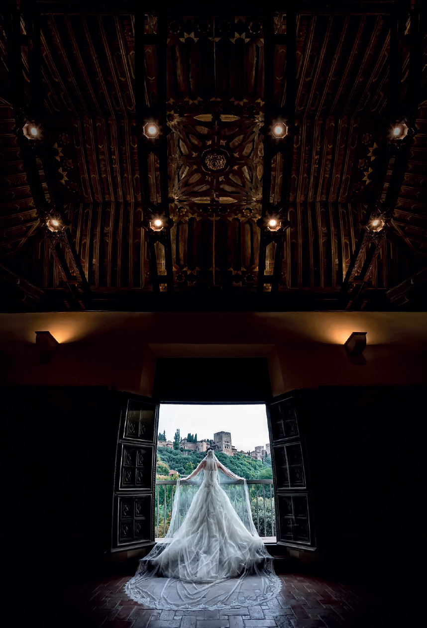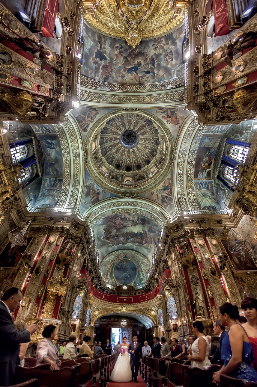 Desde sus comienzos, la fotografía de arquitectura ha sido una de las preferencias de los fotógrafos de Xpression International y les han encargado muchos trabajos en ese campo; por ello, fue una consecuencia lógica aplicar todos sus conocimientos y experiencia en esa especialidad a sus reportajes de boda. En esta fotografía han capturado la emoción de la entrada de la novia con el padre pero también han recogido la impresionante bóveda de la basílica de San Juan de Dios en Granada.