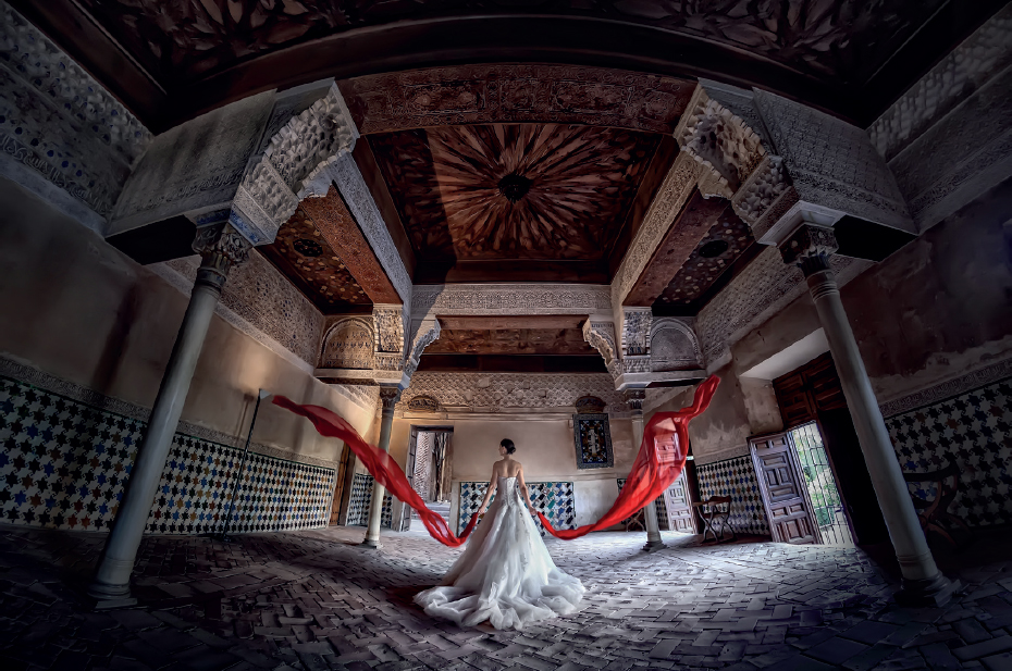 Los reportajes de Xpression International pertenecen al estilo de retrato creativo, pues la mayoría de sus fotografías, como ésta, tomada en el interior de la Alhambra de Granada, no se diferencian de las mejores imágenes en la historia de la fotografía de moda. En esta imagen se condensan las claves de su estilo: una cuidada composición y atención al color, acentuando el contraste con los colores pasteles de la fotografía mediante los velos rojos, una iluminación que destaca las formas y texturas de los tejidos y una exposición perfecta para captar todos los detalles de un entorno espectacular.