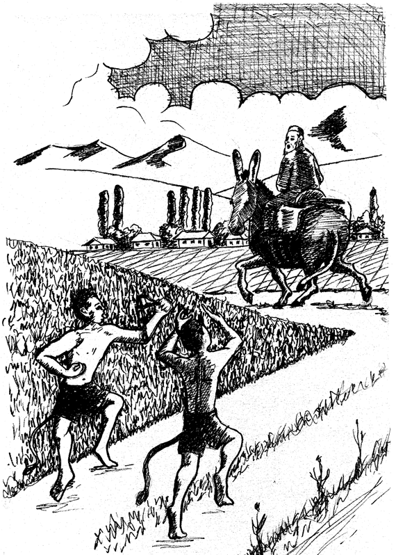 Вислозадый осел, на котором ехал старик, еле плелся. Жара уморила обоих. Старик время от времени слегка похлопывал вислоухого плетью. Летний зной и долгая дорога притомили старика, он был в легкой полудреме.